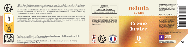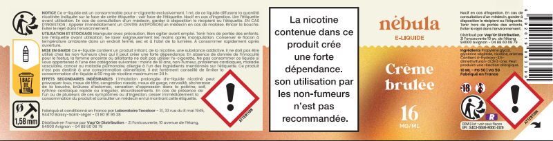 Les e-liquides Nébula sont fabriqués en France par le laboratoire Tecalcor. Avec une composition qui n'a rien à cacher, ils ne contiennent ni métaux lourds, ni plastiques, ni aldéhydes, ni d'alcool ajouté. Ils sont garantis sans diacétyle - sans colorants - sans extraits de tabac.