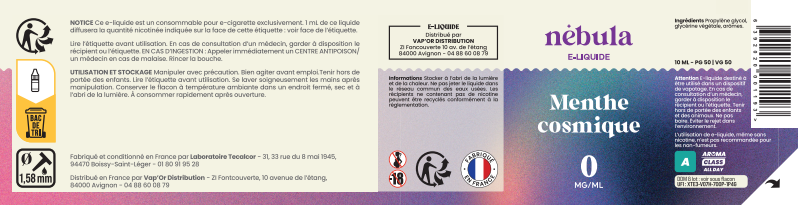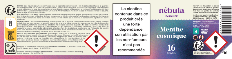 Les e-liquides Nébula sont fabriqués en France par le laboratoire Tecalcor. Avec une composition qui n'a rien à cacher, ils ne contiennent ni métaux lourds, ni plastiques, ni aldéhydes, ni d'alcool ajouté. Ils sont garantis sans diacétyle - sans colorants - sans extraits de tabac.