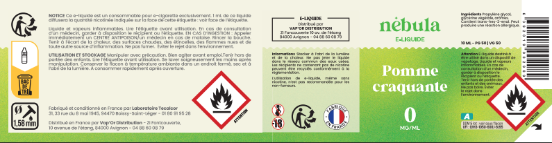Les e-liquides Nébula sont fabriqués en France par le laboratoire Tecalcor. Avec une composition qui n'a rien à cacher, ils ne contiennent ni métaux lourds, ni plastiques, ni aldéhydes, ni d'alcool ajouté. Ils sont garantis sans diacétyle - sans colorants - sans extraits de tabac.