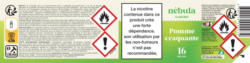 - Nicotine USP : 3mg de nicotine/ml = ATTENTION (H312 : Nocif par contact cutané) ; 6mg et plus de nicotine/ml = DANGER (H311 : Toxique par contact cutané)